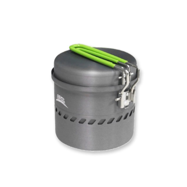 - Каструля (1 л). Товщина стінок становить 1 мм, що забезпечує швидке нагрівання вмісту при помірній витраті палива. Дно з кільцевим дизайном допомагає концентрувати жар, а вбудований вітрозахист запобігає втраті тепла.
