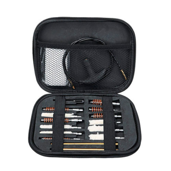 До набору входять складний алюмінієвий шомпол діаметром 5 мм та довжиною 21 см (2 секції з універсальною ручкою), гнучкий шомпол-протяжка діаметром 3 мм довжиною 99 см, йоржики та шерстяні пуховки для різних калібрів (22, 30, 40, 45, 270, 357/38 калібр), патчі для чищення 6 х 6.5 см (45 шт), а також універсальна ручка для шомпола.
