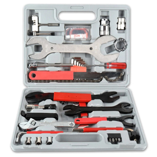 Склад: ключі для рульової колонки, спицеві ключі, знімачі каретки, касети, шатунів і стопорних гайок, вижимка ланцюга, манометр, викрутки, набір шестигранників, педальні ключі, лопатки для шин, латки для камер з клеєм і шкіркою, кутовий адаптер, біти, розвідний ключ, накидні головки, пластиковий кейс та ін.